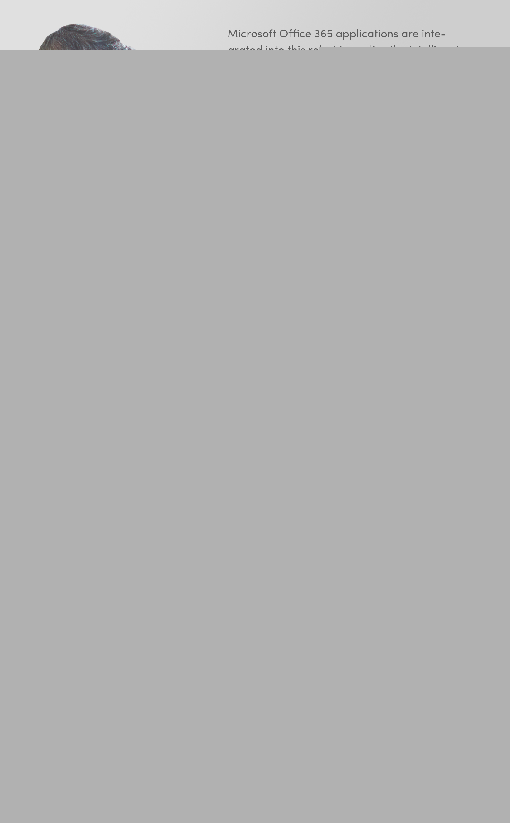 Microsoft Office 365 applications are integrated into this robot to realize the intelligent office services such as sending, receiving email and schedule arrangements. Funchtions like voice recognition, motion control, optical projection and others make its using more convenient and intreresting.